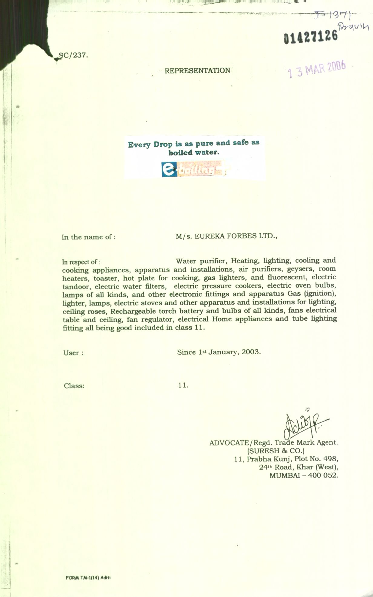 [Class : 11] Water Purifier, Heating, Lighting, Cooling And Cooking Appliances, Apparatus And Installations, Air Purifiers, Geysers, Room Heathers, Toaster, Hot Plate For Cooking, Gas Lighters, And Fluorescent, Electric Tandoor, Electric Water Filters, Electr4 Ic Pressure Cookers, Electric Over Bulbs, Lamps Of All Kinds, And Other Electronic Fittings And Apparatus Gas (Ignition), Lighter, Lamps, Electric Stoves And Other Apparatus And Installations For Lighting, Ceiling Roses, Rechargeable Torch Battery And Bulbs Of All Kinds, Fans Electrical Table And Ceiling, Fan Regulator, Electrical Home Appliances And Tube Lighting Fitting Included In Class 11.