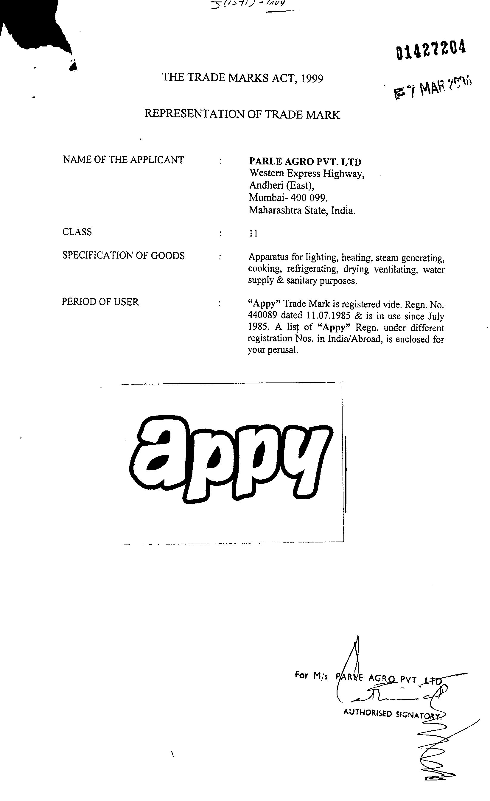 Trademark application was filed by PARLE AGRO.