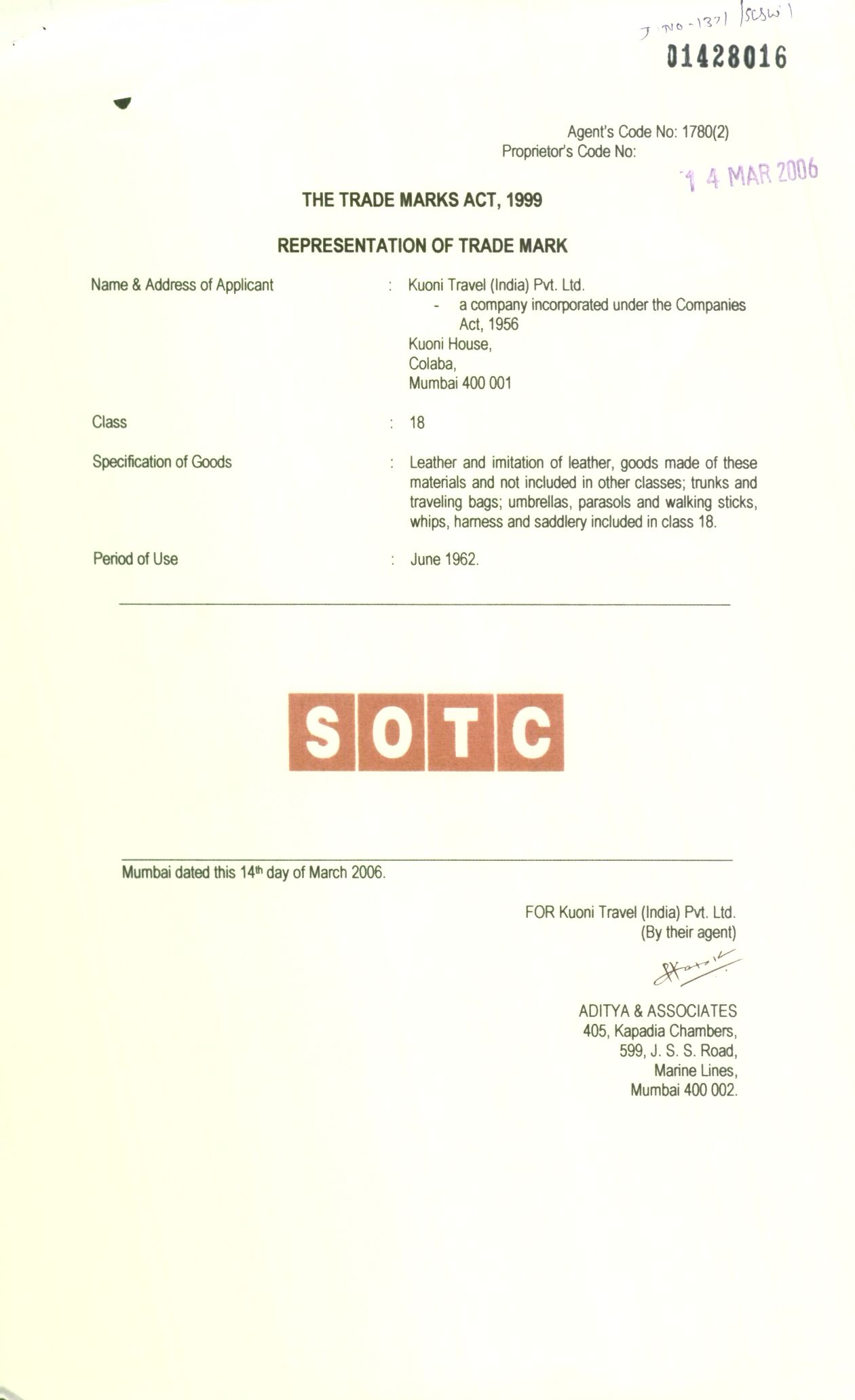 Registration Renewed For A Period Of 10 Years From 14/03/2016 Advertised In Journal No. 1732