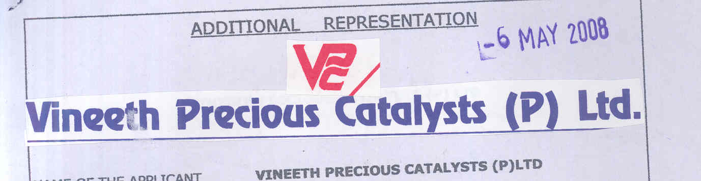 Trademark application was filed by VINEETH PRECIOUS CATALYSTS.